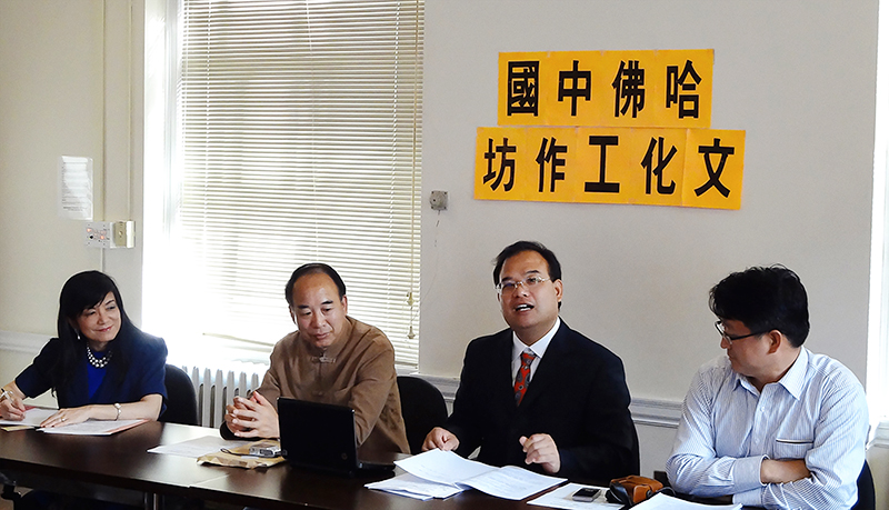 2011年10月,中国微型小说家代表团在哈佛大学燕京图书馆发表学术演讲,从右至左依次为赵智、龙钢华、凌鼎年和哈佛大学主持人张凤